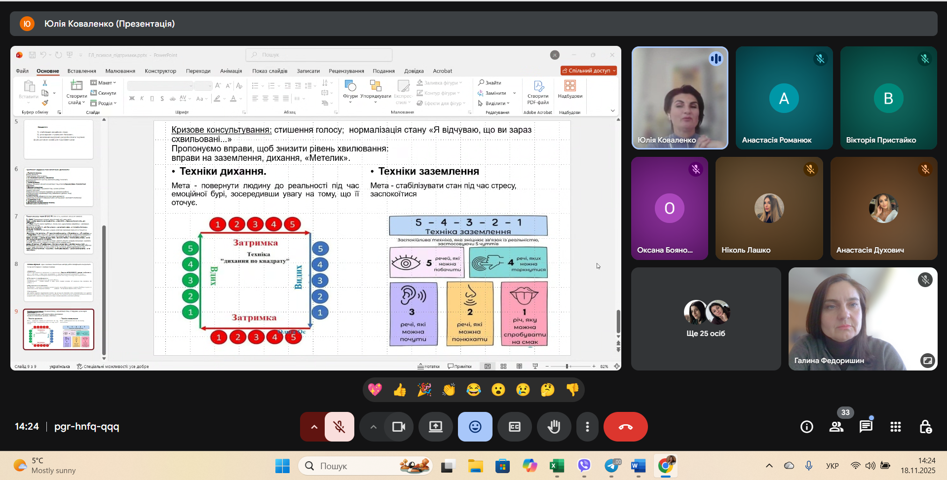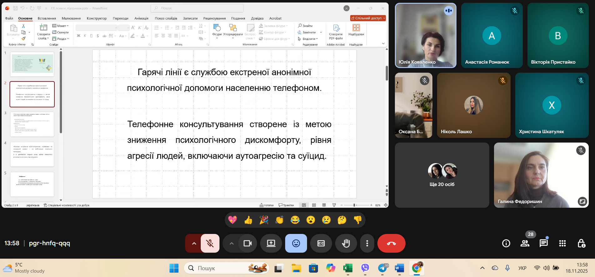 Пані Юлія поділилася історією створення кризової лінії, принципами відбору фахівців і ключовими компетенціями, якими має володіти психолог у цій сфері. Особливу увагу вона приділила темам професійної витривалості, стійкості, здатності «контейнерувати» складні емоційні стани клієнтів.
