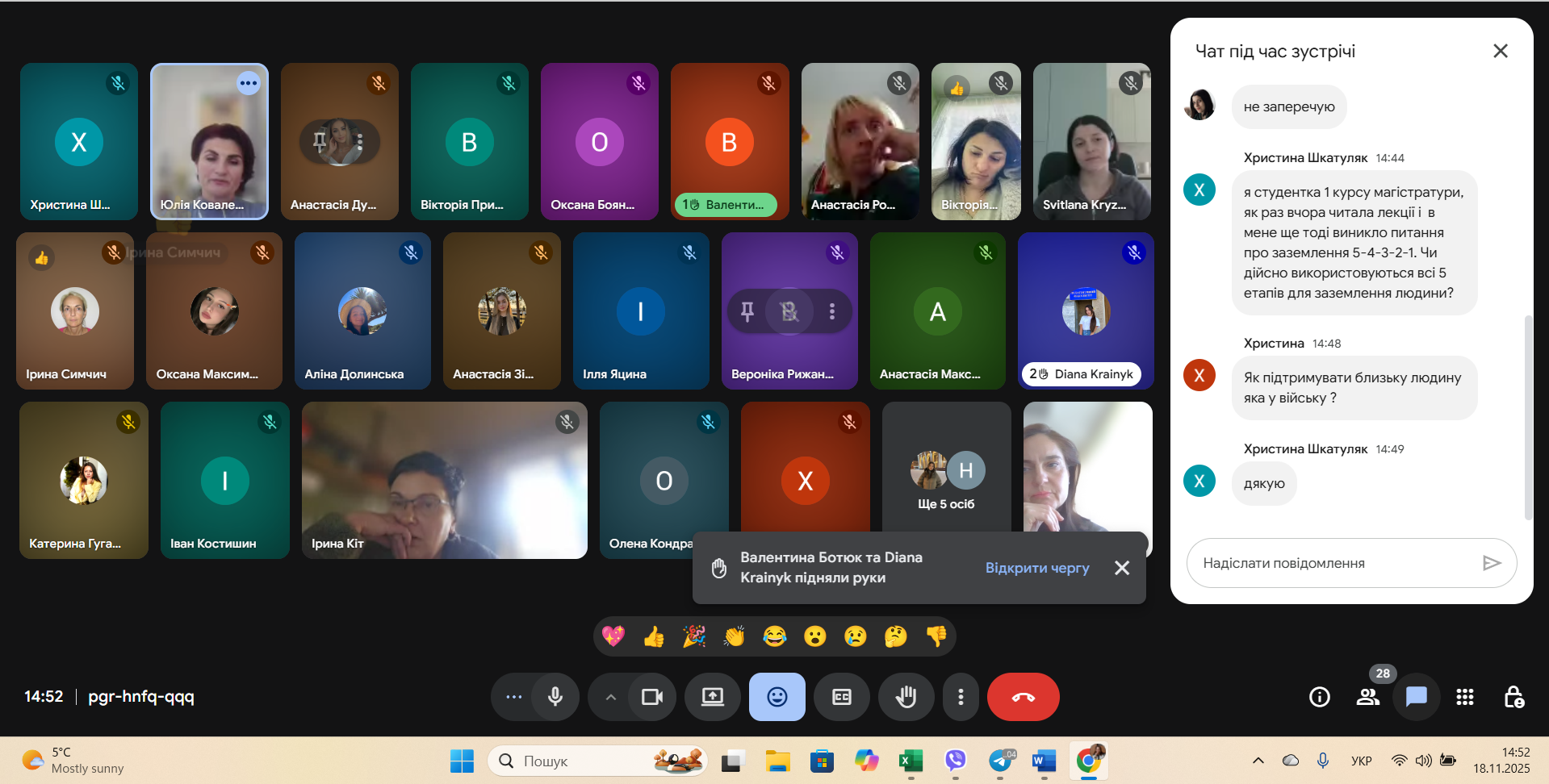 У межах навчального курсу «Кризові інтервенції в роботі психолога» відбулася зустріч магістрантів першого року навчання з Юлією Коваленко — психологом кризової телефонної лінії, що працює з родинами військовослужбовців у межах діяльності ГО «Громадський рух “Жіноча сила України”».