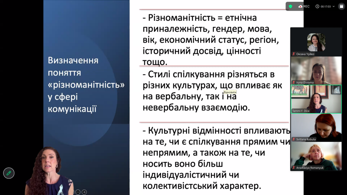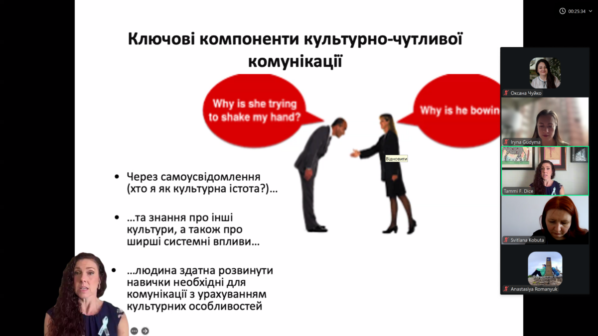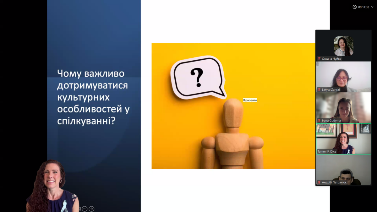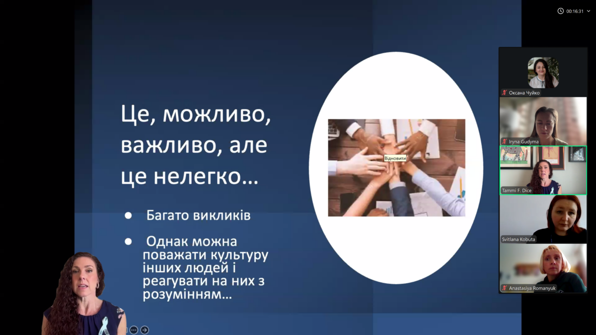 Окрему увагу д-р Таммі Дайс приділила практичним підходам до подолання комунікаційних бар’єрів. Було наголошено на ролі емпатії, активного слухання, уважності до особистого досвіду людини, а також важливості ініціювання відкритих розмов про соціокультурні відмінності. Учасникам було запропоновано практичні інструменти для ведення таких діалогів, які можуть бути застосовані як у професійній діяльності психолога, так і в повсякденному житті.